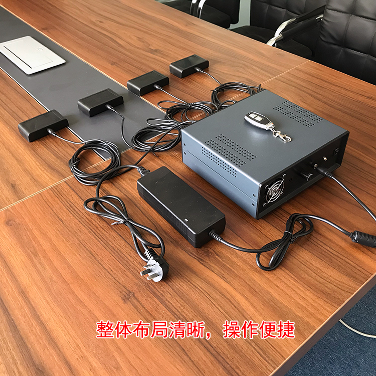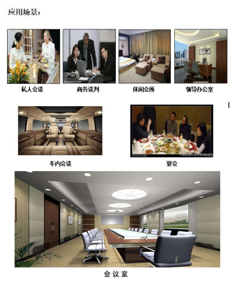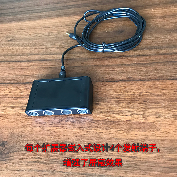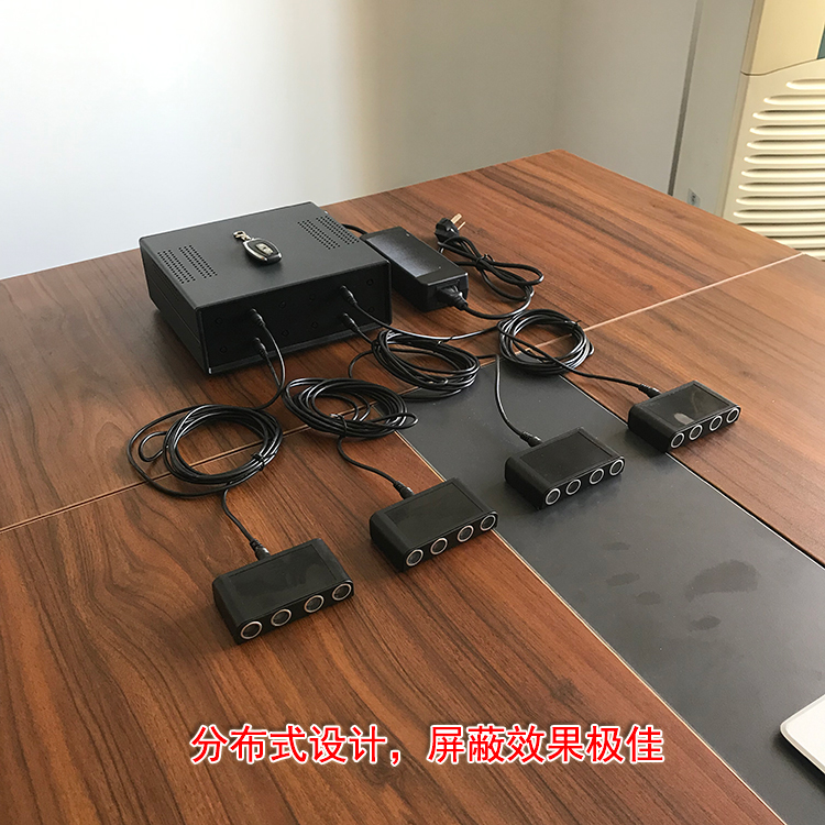 擴展器:擴展器采用注塑殼體,前面嵌有四個金屬信號發射端子,后面為專用線插孔,其尺寸為95*59*23mm外形小巧易于安裝和偽裝,工作時將信號發射端子對準非法錄音者,放在桌面上或粘在非法錄音者座位對著的桌面下沿處(原則距離非法錄音者越近效果越好)。單個擴展器的屏蔽距離:1-2米(不同的錄音設備有差異)擴展器和主機標配線長3米,完全可以滿足一般的場景需要,系統工作時主機在線長允許的情況下可以任意擺放位置。