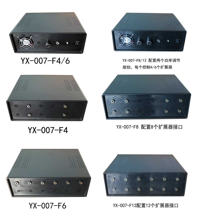 主機設有電源指示燈,電源開關,功率調節旋鈕,散熱風扇,主機背面有X個擴展器接口(YX-007-FX,X=4/6/8/12)。