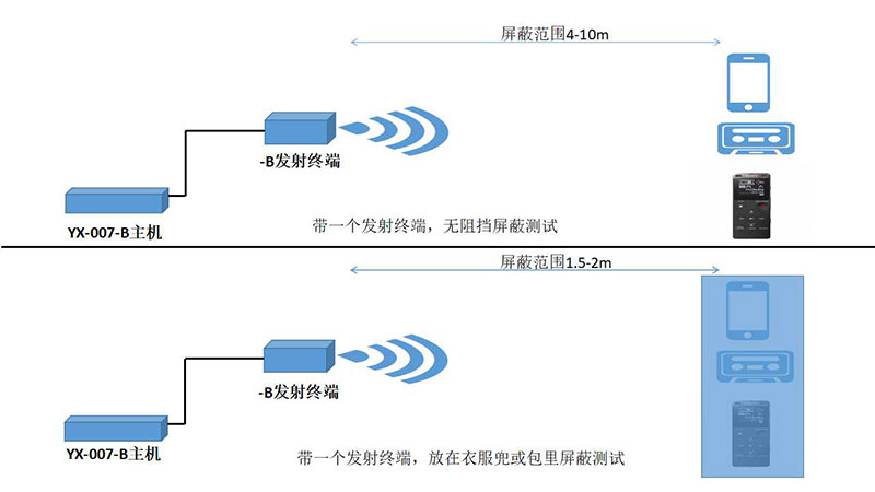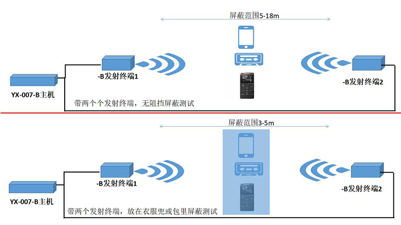 YX-007-B錄音屏蔽系統是我司經過潛心研發的一套全新錄音屏蔽系統。系統分兩部分:1.錄音屏蔽器主機、2.信號發射終端(可選一個或兩個),兩部分通過信號線連接。信號發射終端采用傳統的迷你電腦機箱作為外殼,可以起到很好的隱蔽性。屏蔽器主機采用的調頻和調幅技術輸出強大的屏蔽信號,使錄音設備無法拾取有效的聲音達到完全屏蔽的效果。