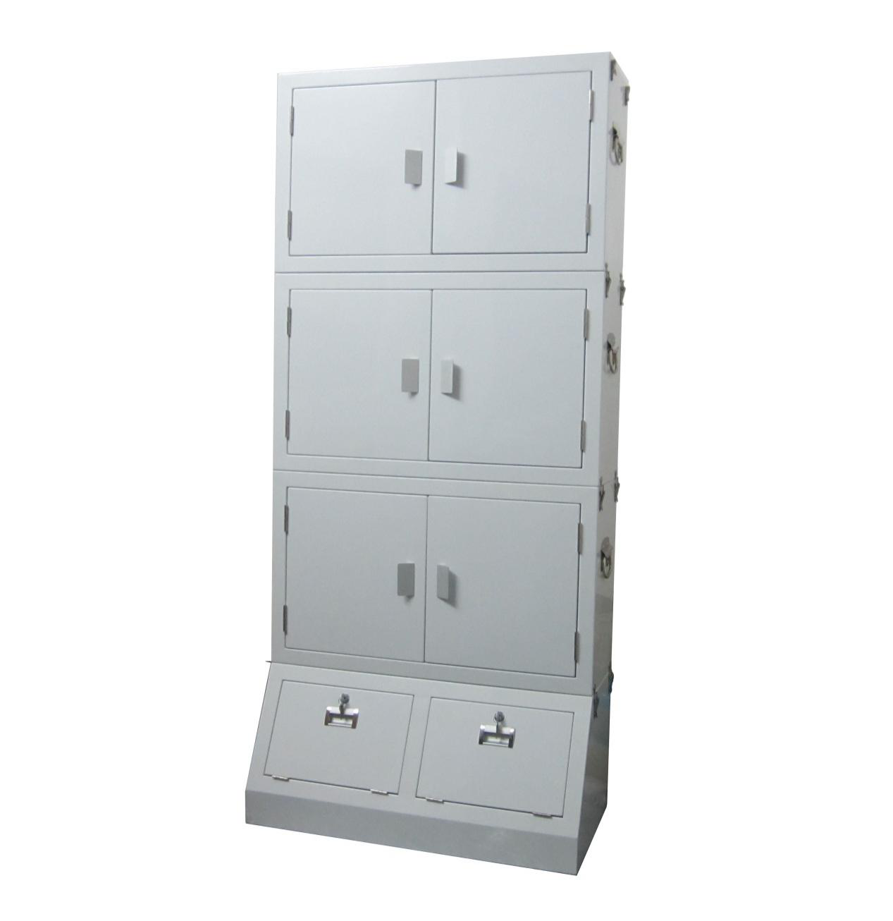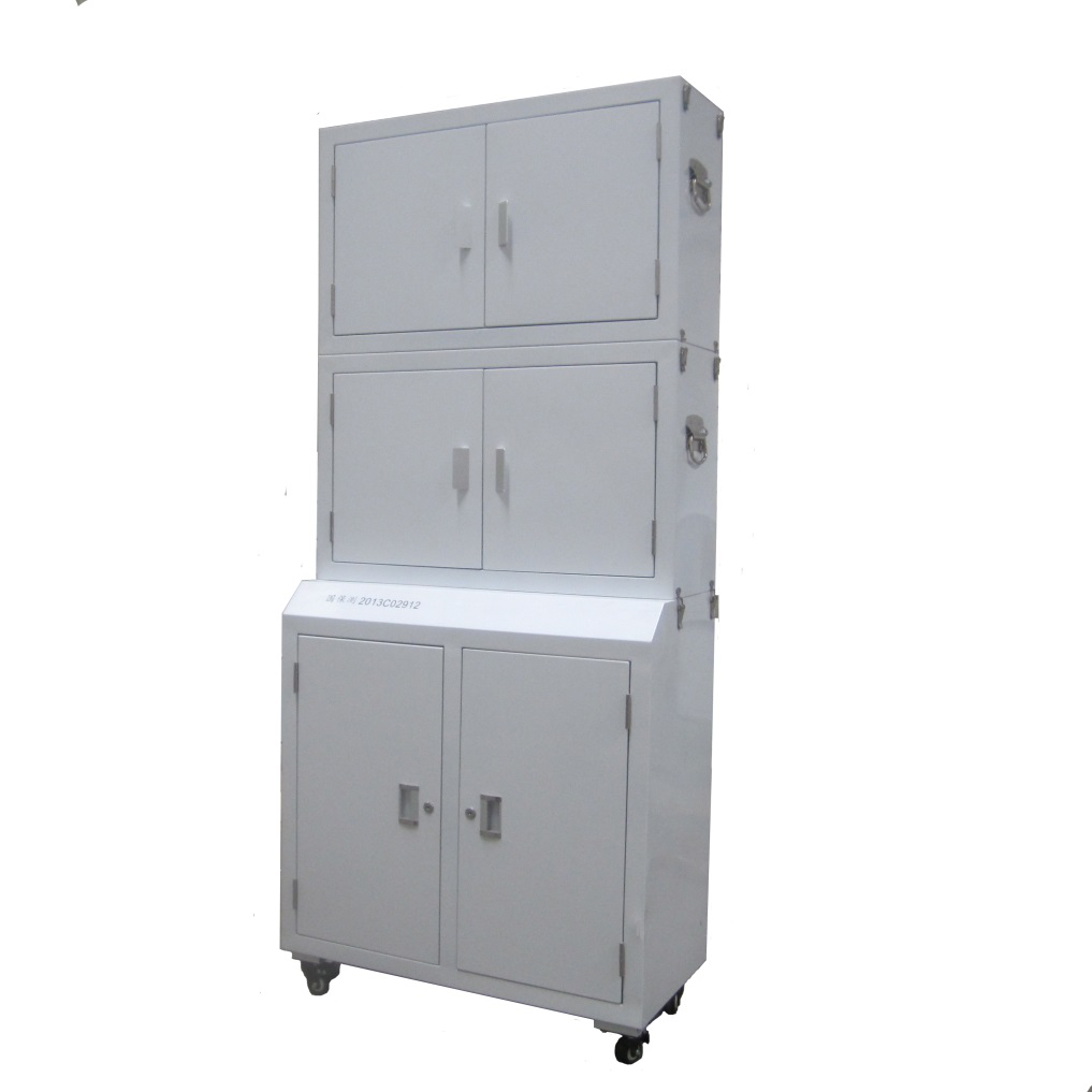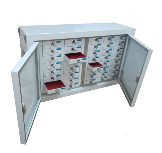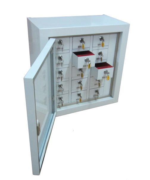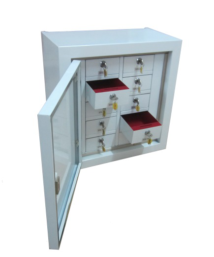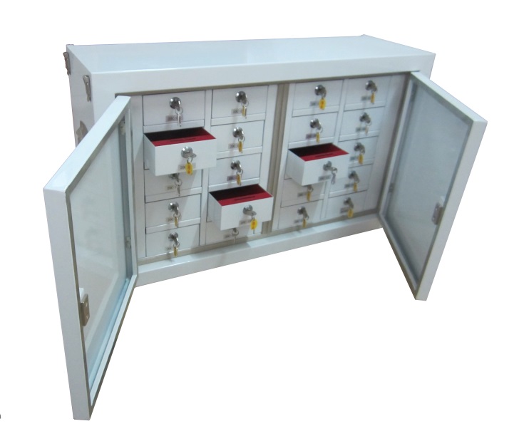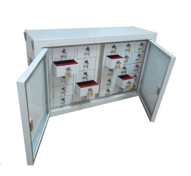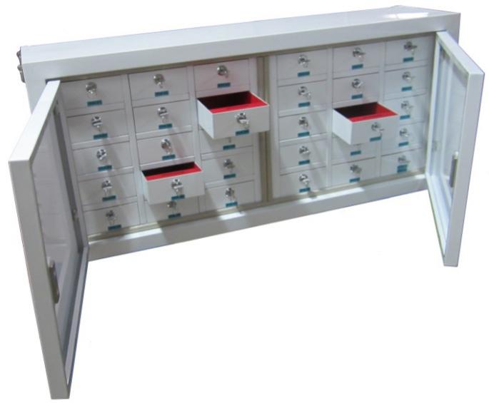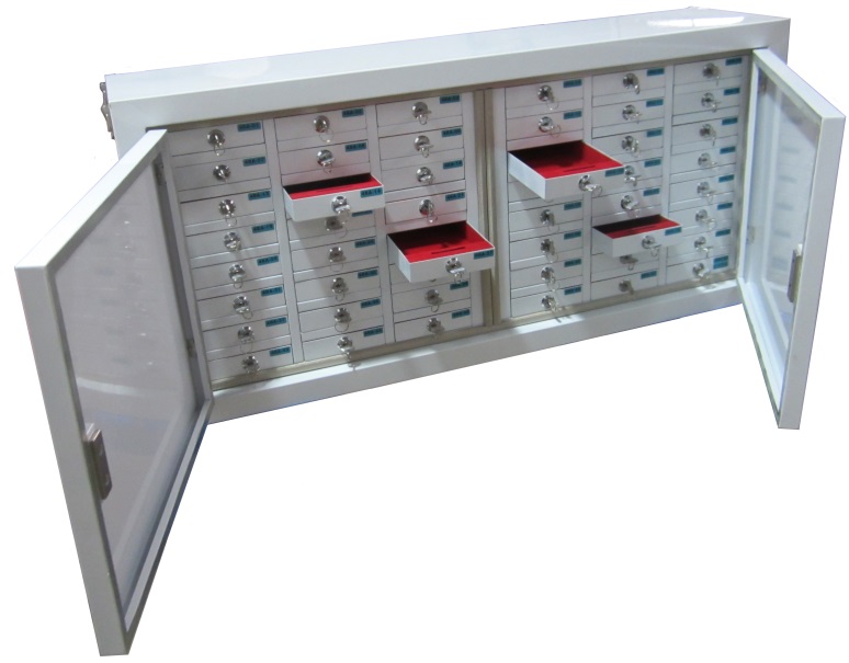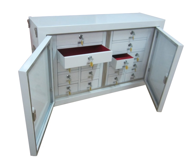 抽屜:抽屜選用0.6mm鍍錫鋼板,由專用模具沖壓成型,保證抽屜形狀大小一致。抽屜兩側設有拉出定位凸臺,后面設有推進到位彈性補償,保證抽屜鎖上后位置準確一致。抽屜內采用絨布內襯裝飾,美觀大方、手感柔軟舒適。